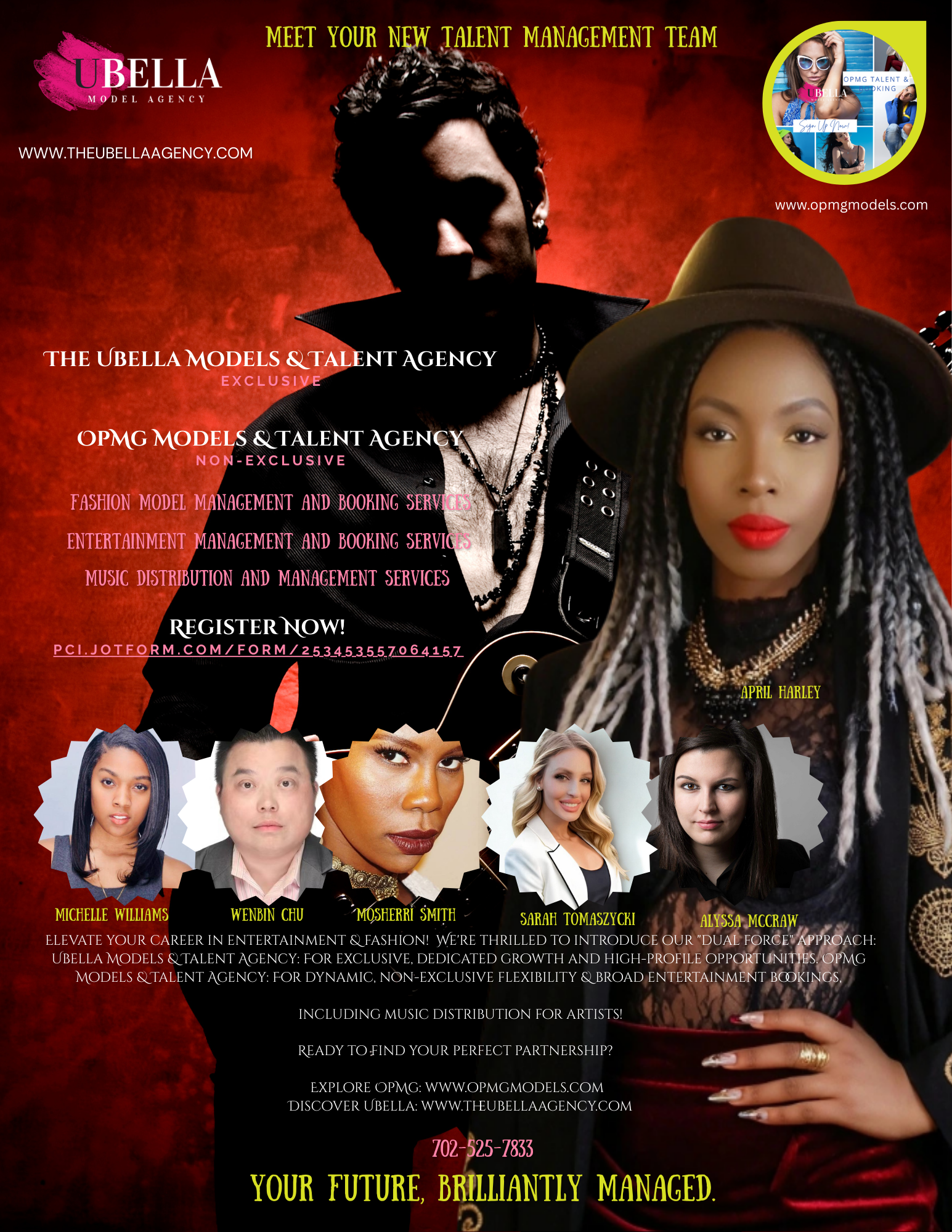 Dear talent, We're excited to invite you to join our exclusive community on OpMgModels.com. This innovative platform is designed to help you take your career to the next level. As a member of our community, we know you're passionate about, fashion, music, etc.. With OpMg Models & Talent Agency and The Ubella Models & Talent Agency, you can: Connect with like-minded individuals: Network with fellow enthusiasts and build valuable relationships. Showcase your talent: Create a personalized profile to showcase your work and expertise. Engage your audience: Share your latest projects, news, and events with ease. Grow your following: Utilize powerful marketing tools to reach a wider audience. Ready to take the next step? Sign up for free today at https://www.opmgmodels.com/registration and start exploring all that OpMg Models & Talent Agency has to offer. We can't wait to see you there! Looking for representation? Submit your application and get a full team of talent booking agents behind your career. APPLY NOW at: https://www.picktime.com/home/theubellaagency Best regards, OpMg Models & Talent/ The Ubella Models & Talent Agency Administration Team