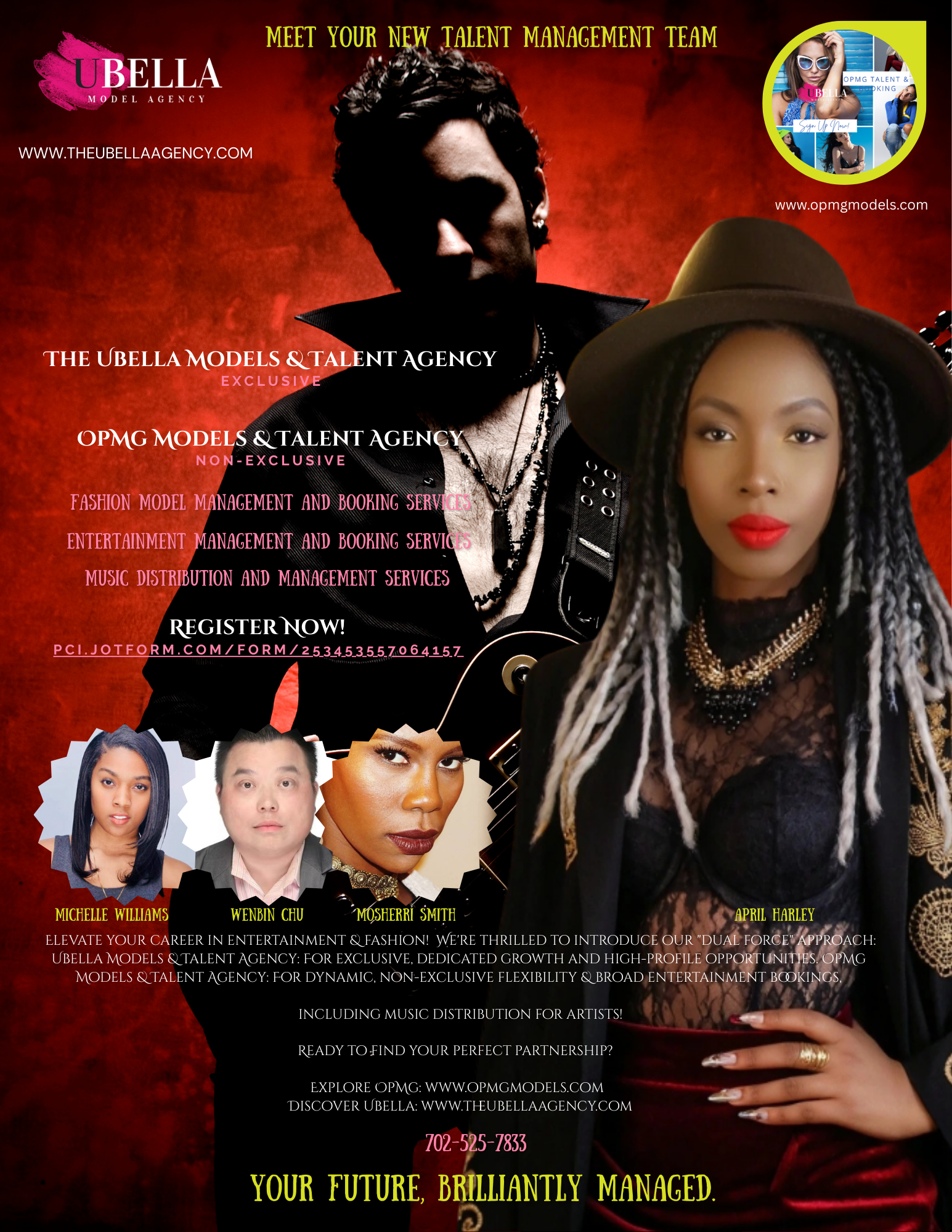 Website: www.theubellaagency.comMeet the Powerhouse Team Shaping the Future of Talent We are thrilled to introduce the visionary booking agents behind our roster. From global market strategy to creative brand architecture, this team brings an unparalleled blend of experience, grit, and innovation to the entertainment industry. The Team Wenbin Chu: A graduate of Pomona College, Wenbin is a results-driven strategist specializing in global market expansion. He brings a sophisticated, consultative approach to the industry, expertly bridging the gap between elite talent and premier international opportunities. Michelle Williams: A true industry prodigy, Michelle’s journey began behind the microphone before she pivoted to the architecture of the business. After being accepted into the prestigious Full Sail University at just 17, she has dedicated her career to building the frameworks that drive musical success. MoSherri Smith: With over 15 years of experience as a multifaceted beauty model and musician, MoSherri understands the industry from the inside out. Known for her creative versatility, she has high-profile collaborations with designers like T-Shemise and Stevie Boi under her belt. April “Gigi Maxx” Harley: A communications architect and cultural strategist, April focuses on long-term brand value and sustainable growth. As a Booking Agent and Talent Manager, she leverages her extensive background in media and creator-led ventures to turn talent into icons. Our Mission: Whether it’s securing global stages or architecting a sustainable brand, our agents are dedicated to elevating talent through precision, passion, and decades of collective expertise. Get to Know Us Better Our agents bring a unique blend of academic excellence and real-world industry grit to every deal they broker. Read the full biographies at: www.theubellaagency.com/casting Apply To Be Considered For Representation We look forward to reviewing your submission and potentially seeing you as the next face of our brand. Warmly, Lydell Michaels CEO & Owner | The Ubella Models & Talent Agency Phone: 702-525-7833 Email: booking@theubellaagency.com Website: www.theubellaagency.com0 Commenti 0 condivisioni 48 Views 0 Anteprima -